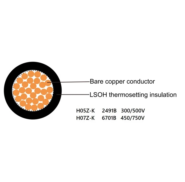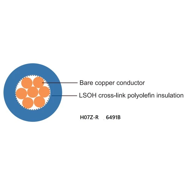 LSZH изолиран едножилен кабел, който се състои от T1R меден проводник и LSOH полиолефинова изолация с кръстосана връзка (наричана още LSOH термореактивна).